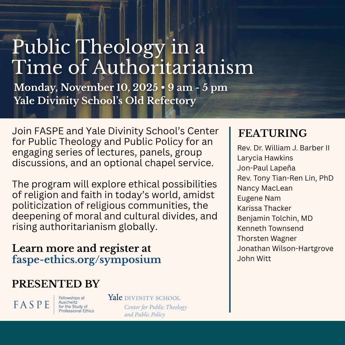 But before I share that, I want to also invite you to an in-person conversation on campus at Yale Divinity School on November 10th. We’re hosting a day-long symposium on “Public Theology in a Time of Authoritarianism” and we have an incredible group of people coming to help us consider these questions together. Space is limited, but you can learn more and register at: https://www.faspe-ethics.org/symposium/